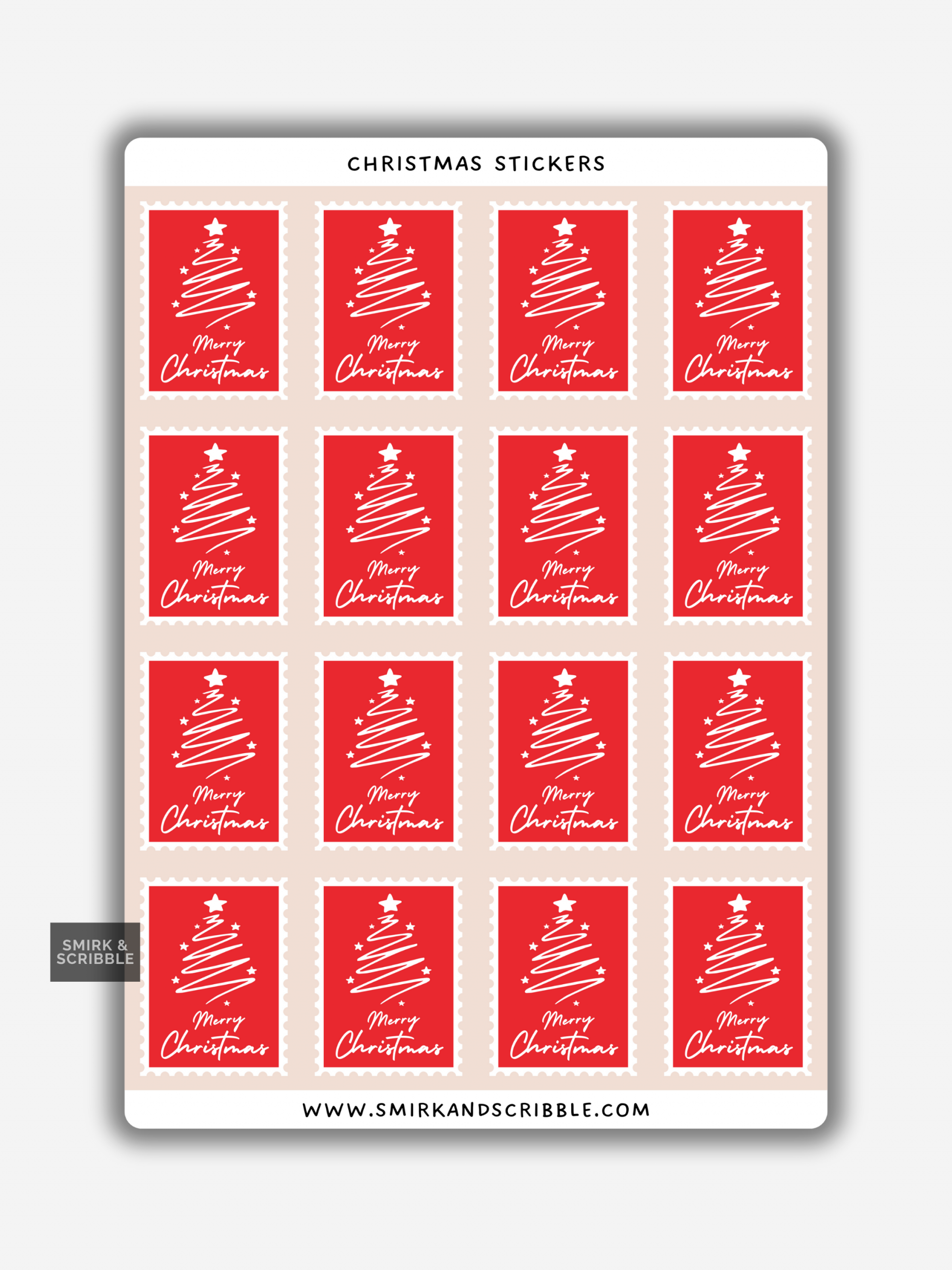 These Merry Christmas tree stamp stickers add a bright and festive touch to your wrapping. Each sticker features a simple white Christmas tree on a bold red background, designed in a clean line-art style. The stamp border gives each sticker a neat and classic look. This set suits adults who enjoy modern, minimal Christmas designs that still feel cheerful and warm.
