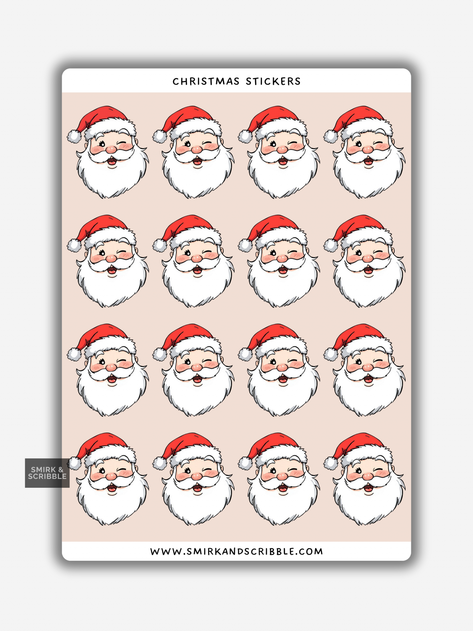 Santa Face Christmas stickers on a sheet with cheerful Santa illustrations.